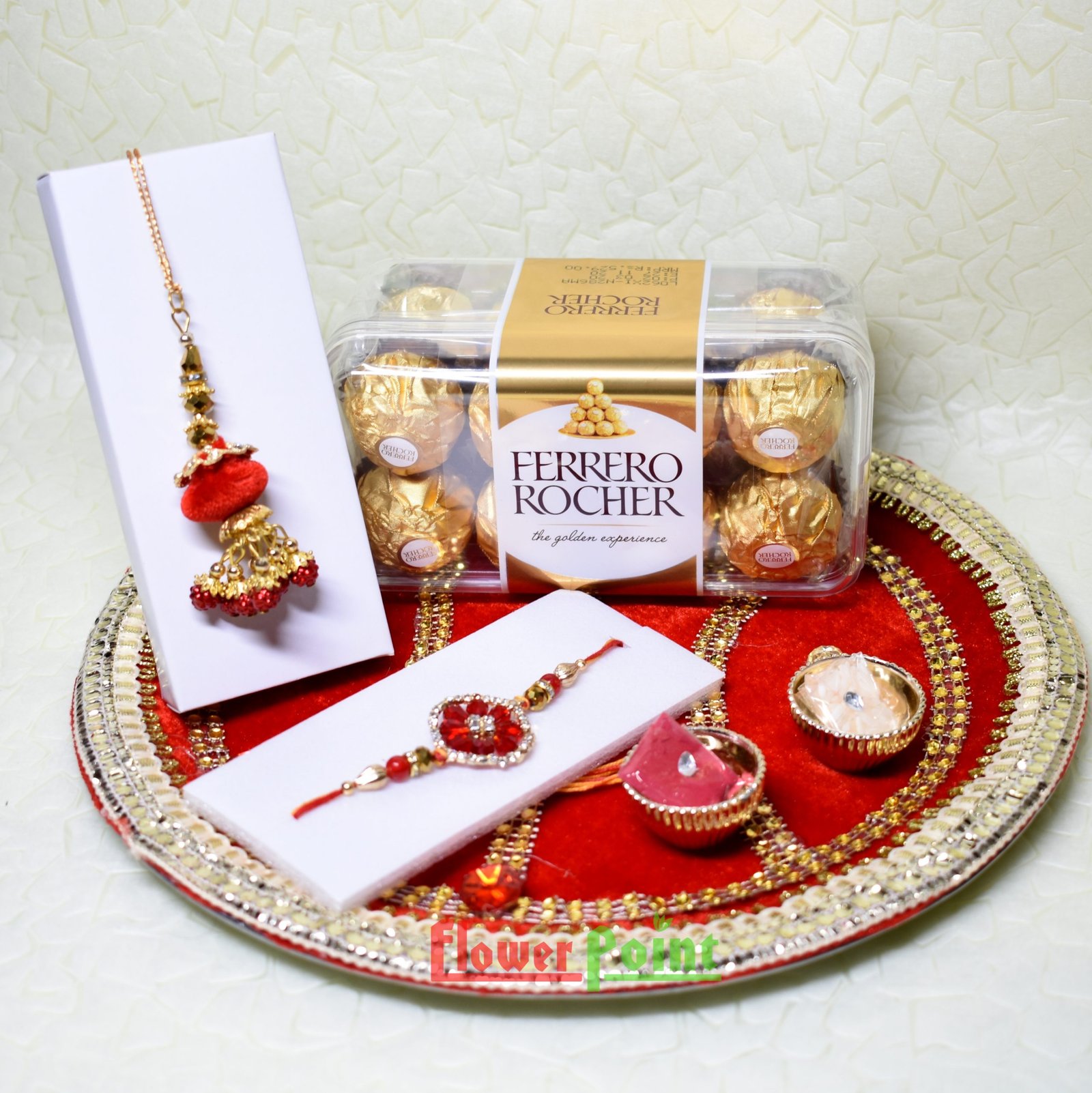 Rakhi with tikka chawal & 16 pcs Frerro Rocher box in a beautiful thali.