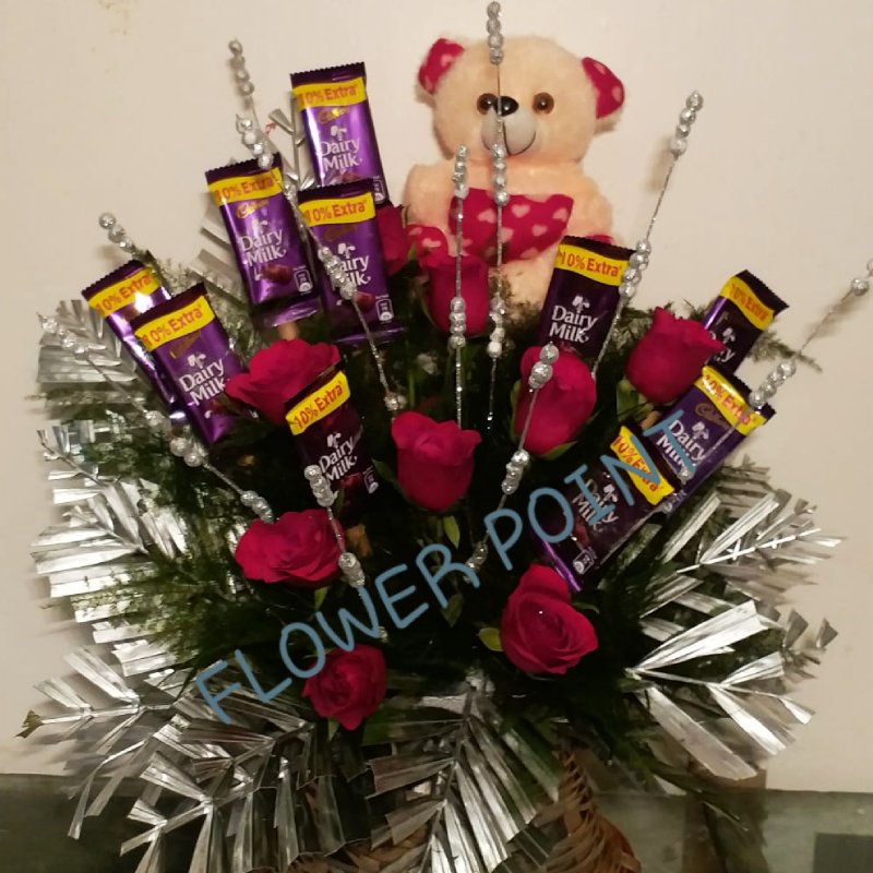 Basket of 10 dairy milk chocolates 22gm, 10 roses & 6 inches cute teddy bear.